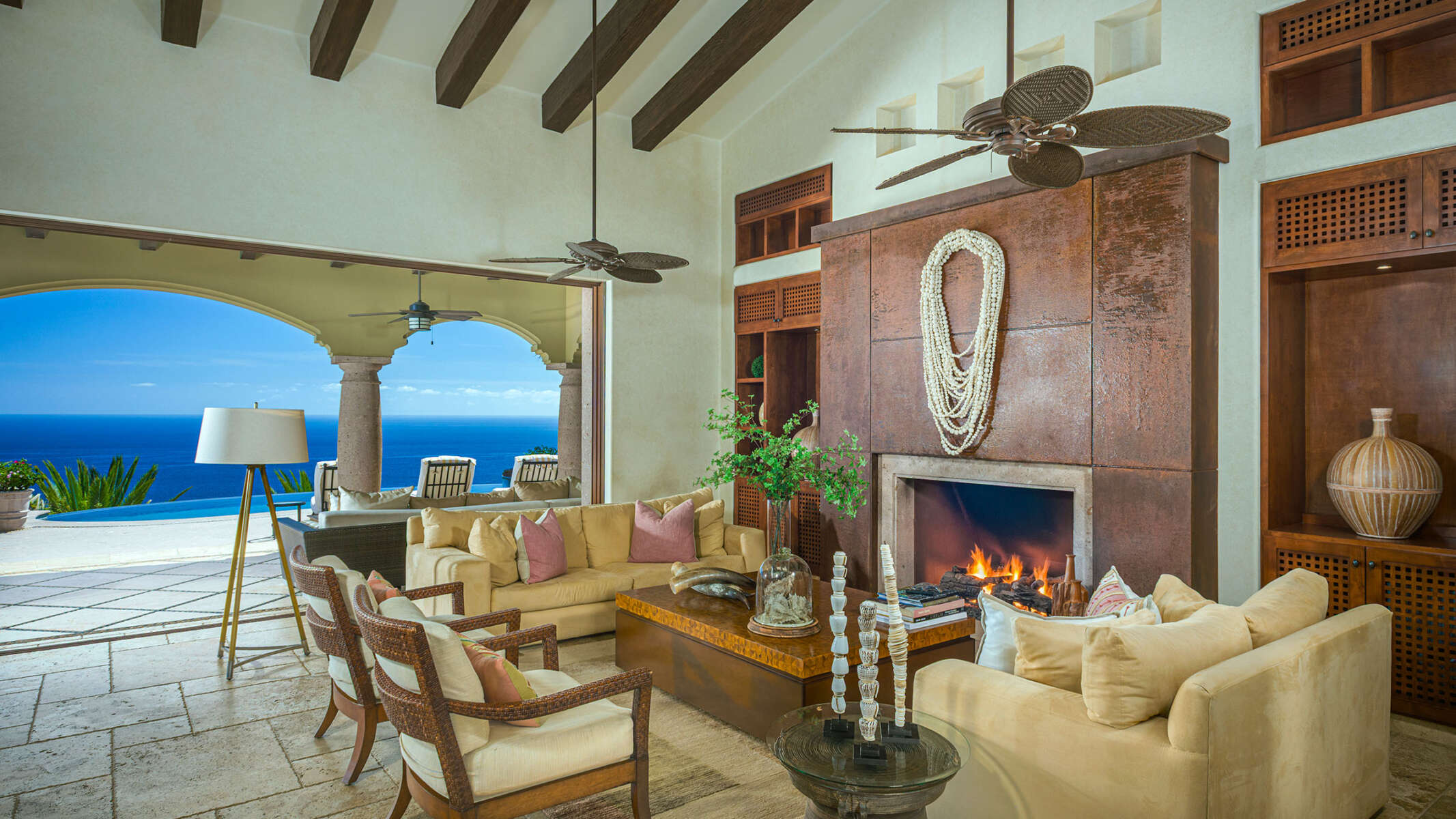 Outside, the infinity-edge pool, jacuzzi, sun loungers, and firepit invite effortless relaxation against an unmatched ocean backdrop.
