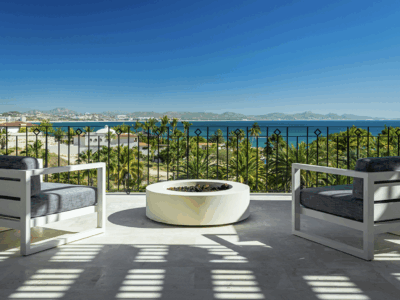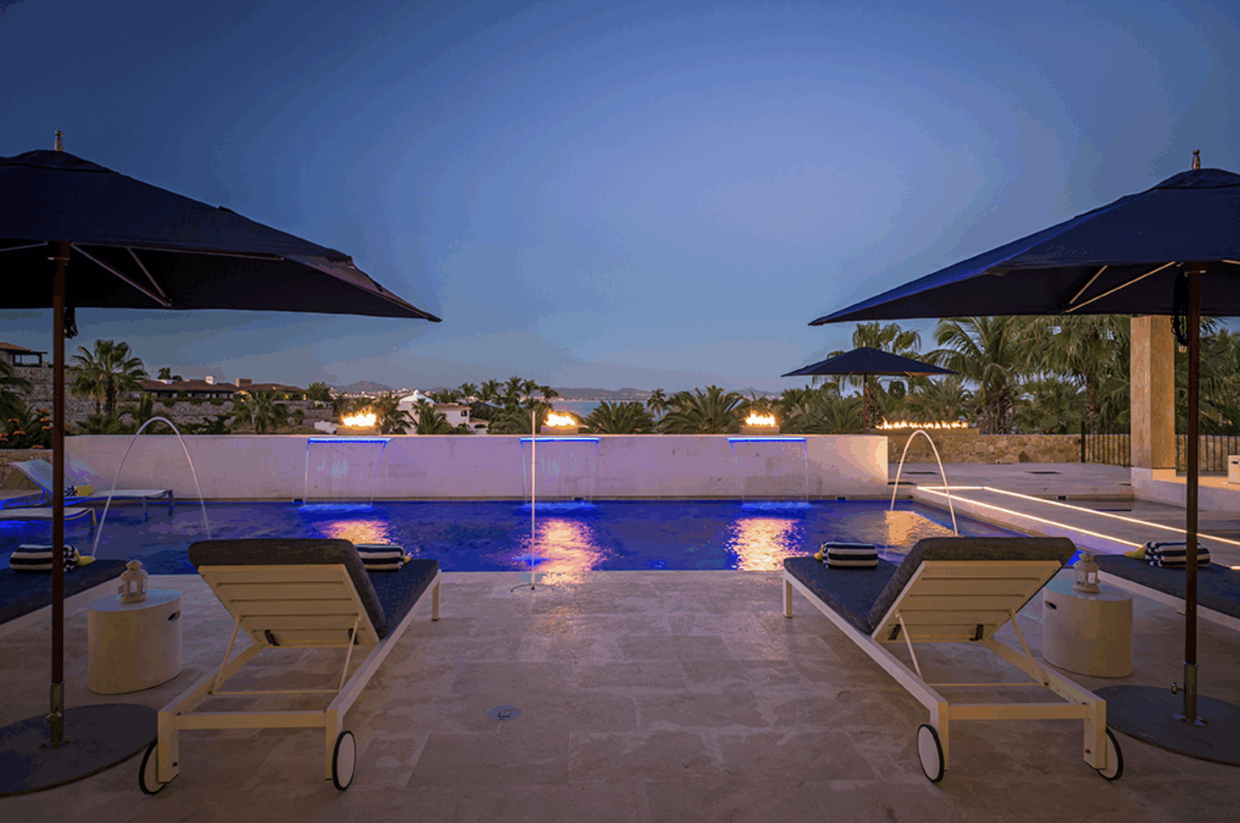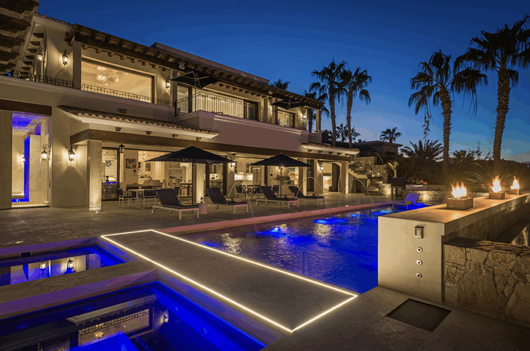 Only a two-minute walk from the beach, it offers private access and a perfect balance of sophistication and seaside living. Expansive outdoor areas feature multiple lounges, a large pool with fountains and waterfalls, a cold plunge, and dramatic fire-and-water elements. A wood-fired pizza oven adds warmth and charm to outdoor gatherings.