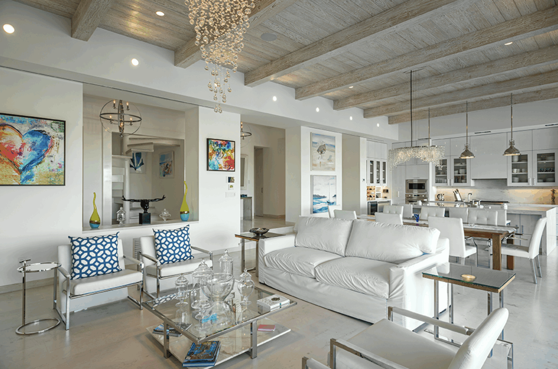 Inside, open and airy spaces flow seamlessly, with colorful accents and a gourmet kitchen featuring top-tier appliances, a wine bar, and a glass wine wall that holds over 500 bottles.